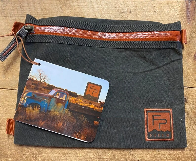 This a waxed cotton tool pouch. About 8 x 10”. Has a rubberized zipper . Ends have loops and you can clip several together for trips, classes or demos. Ideal for fly tying or artist tools. Makes a great stuff bag for materials or electronics’ cables and plug ins. Will also work as a travel pouch for head phones.