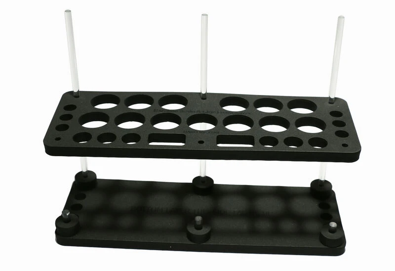 The Hareline Foamanizer Glue & Resin Module has a die cut base with slots cut to hold glue and resins. This module attaches the side of a tool base to keep resin and glue from spilling. Ideal for colored resin, super glues, head cements and more.