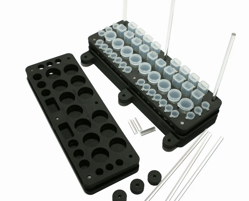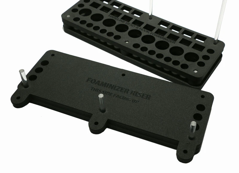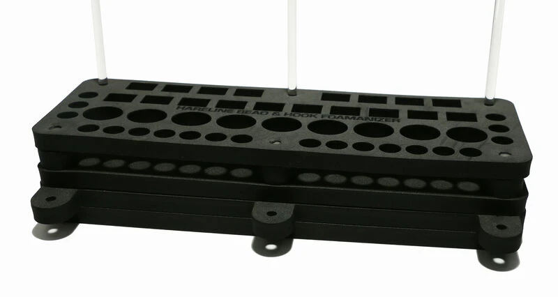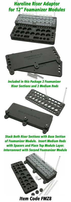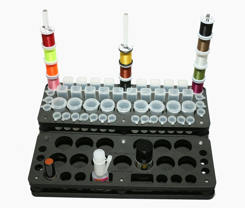 The Hareline Foamanizer Adapter are large risers used to created stadium style stacks. Use these with 12” modules. This allows you to have 2 sets of modules back to back. For example you can put thread in the module and glue in the front. This will reduce the overall foot print and take up less total space.
