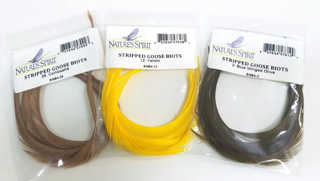 Nature’s Spirit Stripped Goose Biot ( Pack of 4 ) , these are split strips from goose quills, just the Biot section. Use these for Prince Nymphs, nymph bodies, stoneflies or as tails on nymphs.